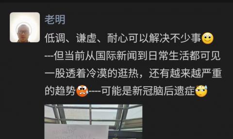 低调、谦虚、耐心可以解决不少事---但当前从国际新闻到日常生活都可见一股透着冷漠的逛热,还有越来越严重的趋势----可能是新冠脑后遗症。